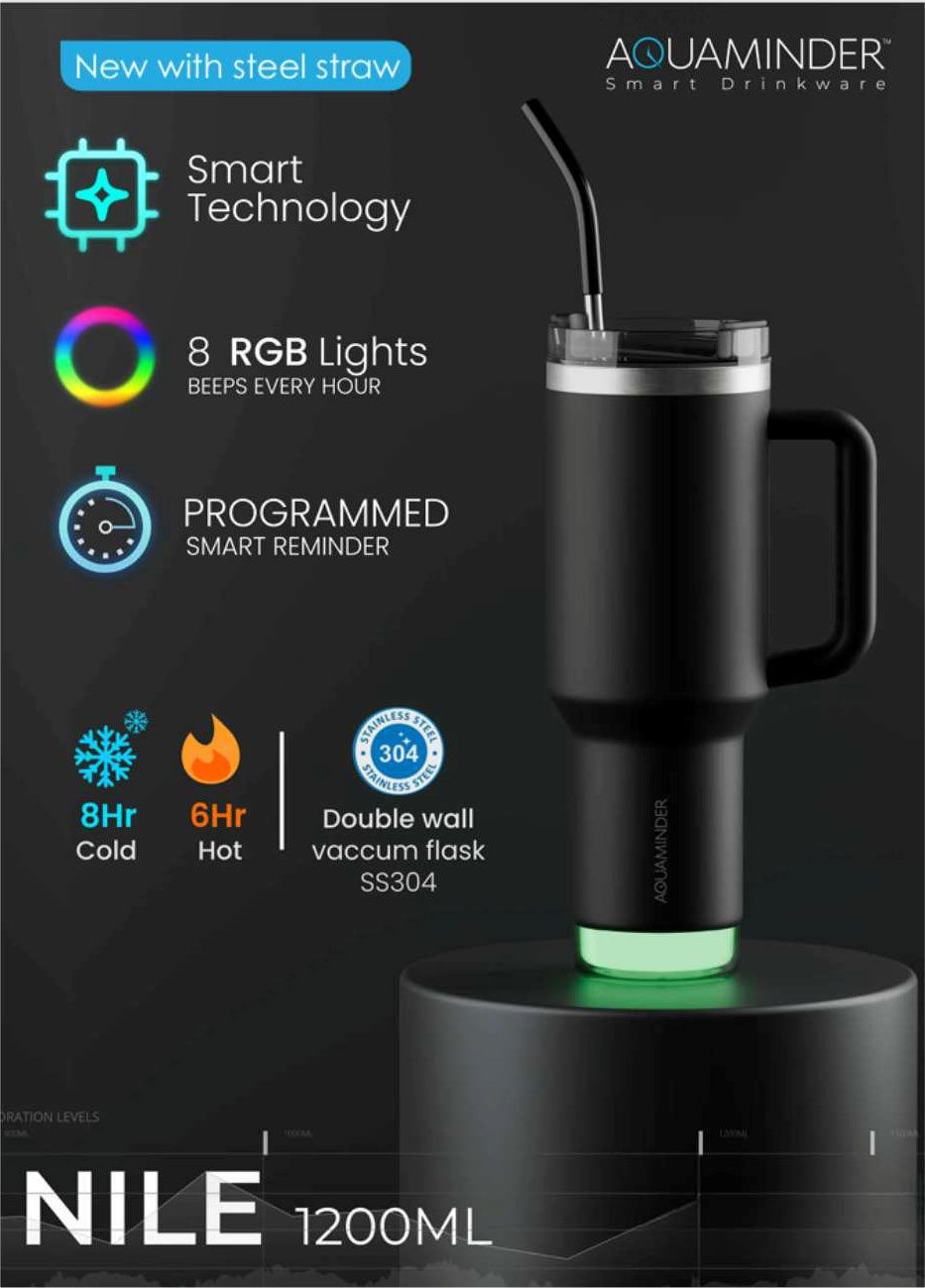 Say hello to the Aquaminder Nile Smart Mug — a double-wall insulated bottle with RGB hydration reminders, temperature lock, and intelligent lighting. At 1200ML, it’s a stylish yet practical way to promote wellness and daily hydration among teams.