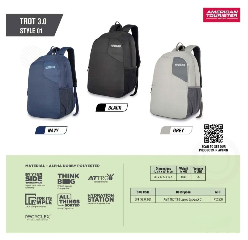 For reliability and global brand recognition, American Tourister’s Trot 3.0 series represents the perfect balance of quality and prestige. Available in professional Navy, Black, and Grey options, this lightweight yet durable backpack offers both style and substance.