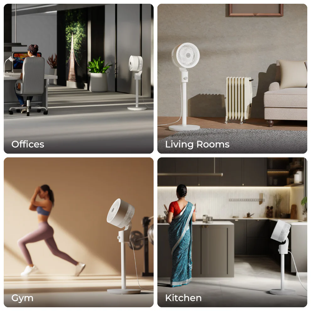 Switch between table fan, pedestal fan, and floor circulator configurations to suit your space and comfort.