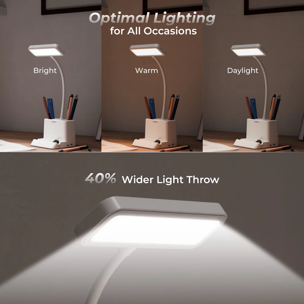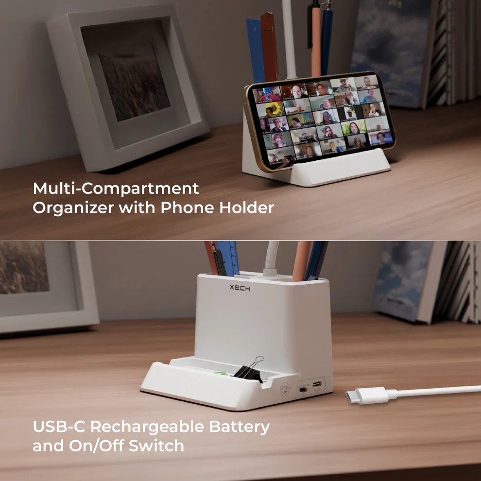 Transform your workspace, clinic, or office with the XECH Desky Lite with Bell – a table lamp with a wireless bell for seamless communication. Featuring 3-color dimmable lighting, a flexible gooseneck, and a 40% wider light throw, this lamp ensures optimal workspace illumination. The dual-compartment organizer and smartphone holder keep your desk clutter-free. The 100ft RF-transmitting bell with a siren & flash makes it perfect for doctors, professionals, and home offices. Rechargeable & portable, this smart lamp is an essential upgrade for modern workspaces