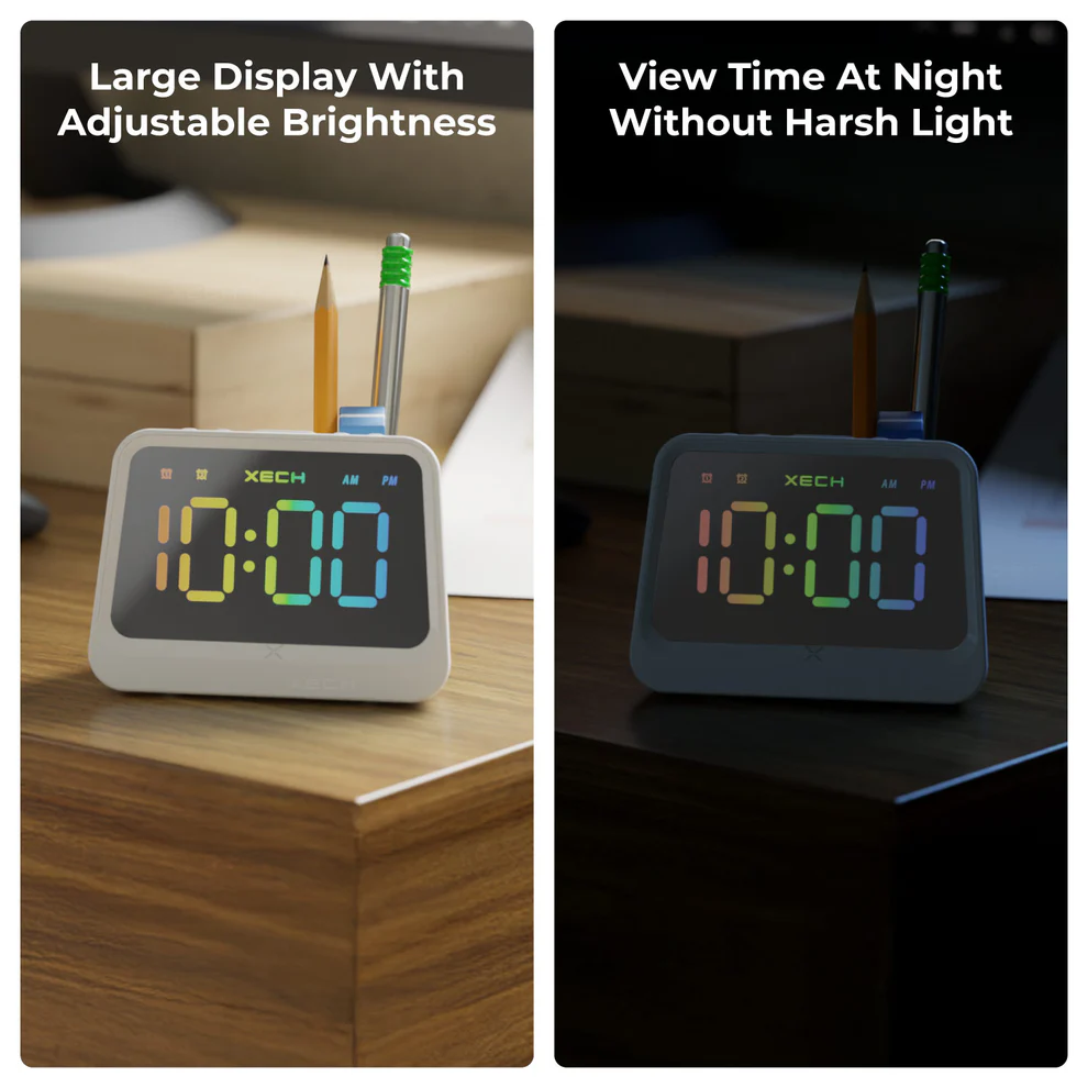 Looking for a compact desk essential that does it all? Meet the XECH Prism PRO. This modern digital alarm clock features a powerful 5W Bluetooth speaker, vibrant multicolour display, dual alarms, and an integrated pen stand. Whether it’s on your study table, office desk, or bedside, Prism PRO adds functionality and flair. Auto-sync time ensures accuracy, while USB-C charging keeps it wireless and hassle-free. Great for kids, professionals, or as a smart gift for birthdays and office occasions.