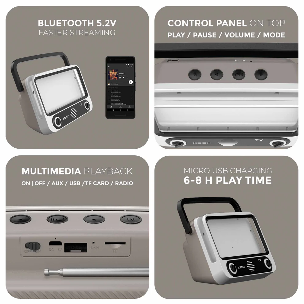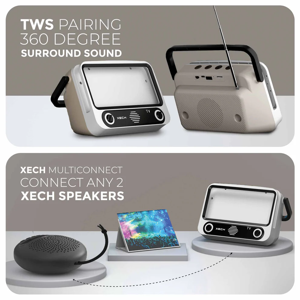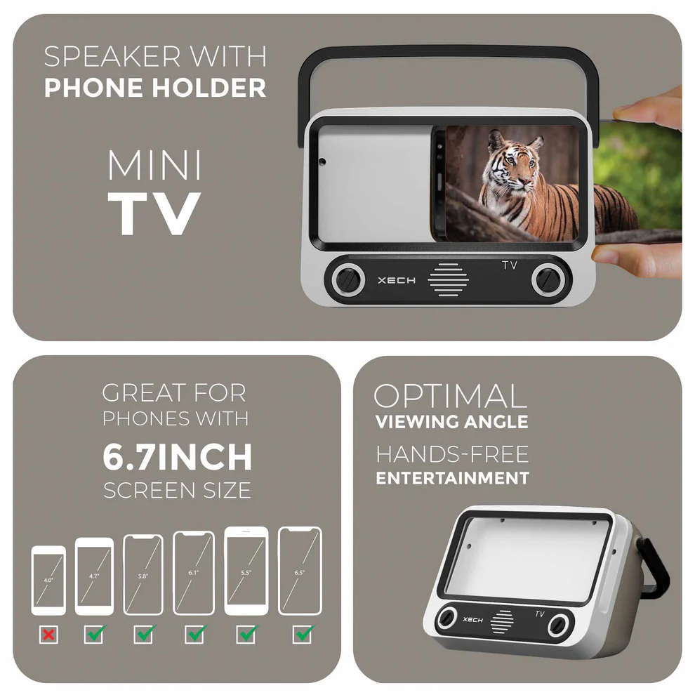 XECH Tellivibe Max is an innovative Bluetooth speaker with a smartphone holder and a retro radio design that allows you to go hands-free as you immerse yourself & enjoy your favourite shows & movies.