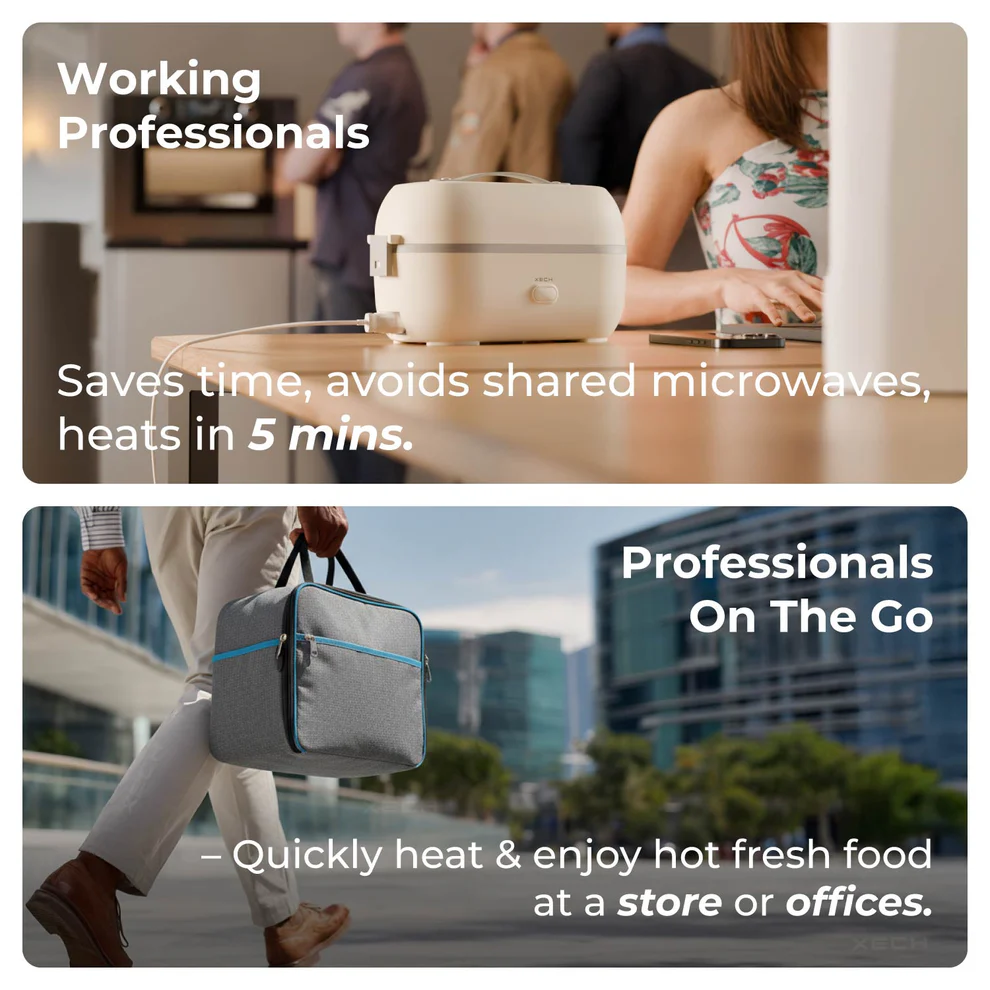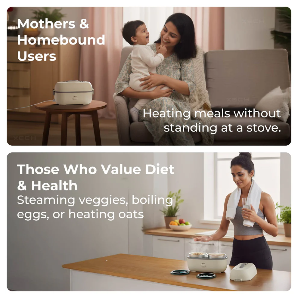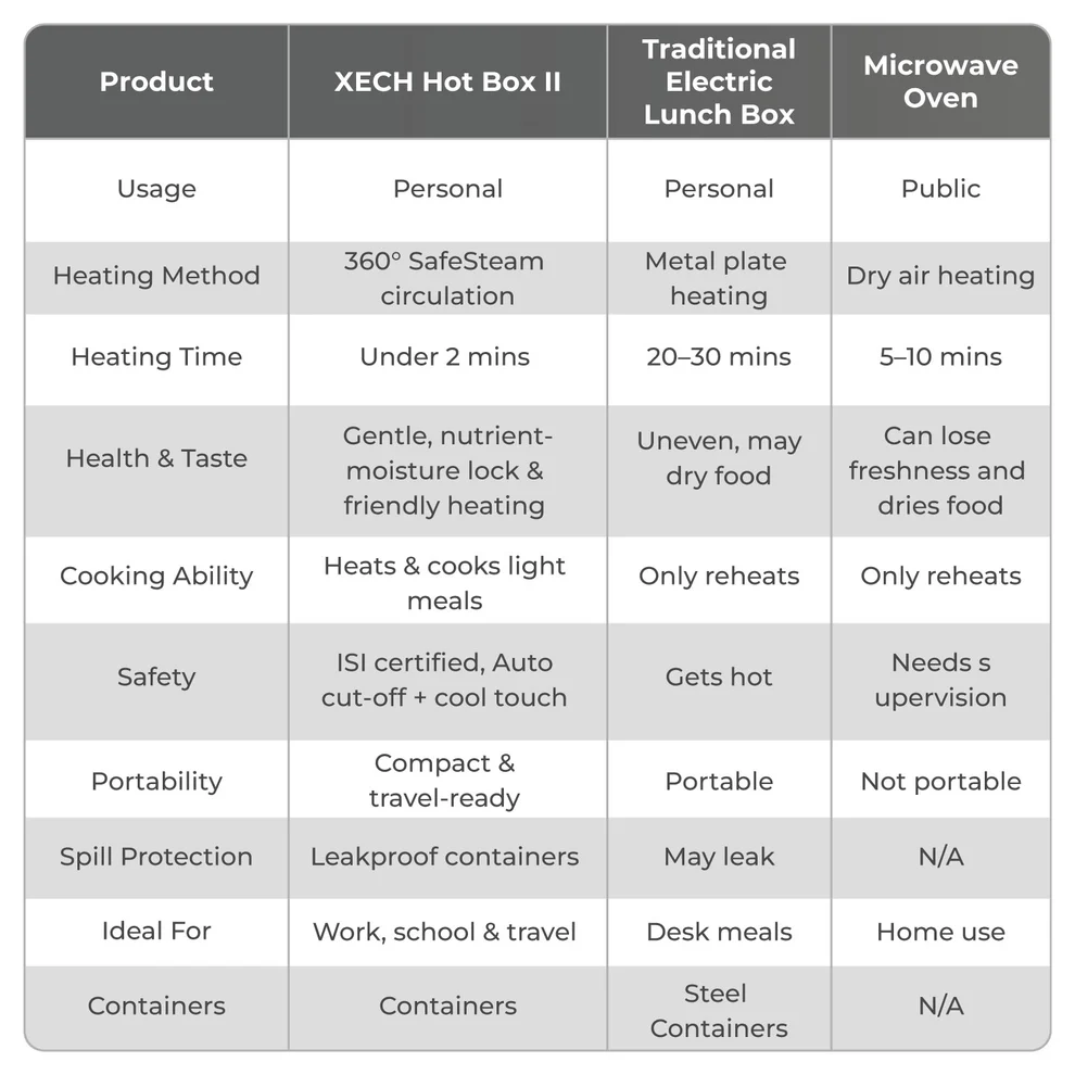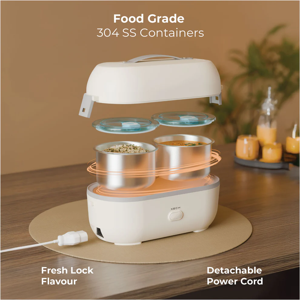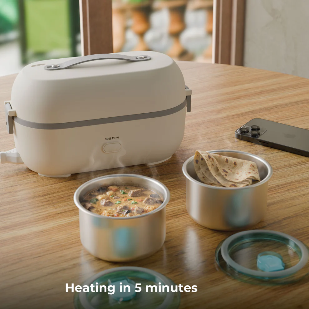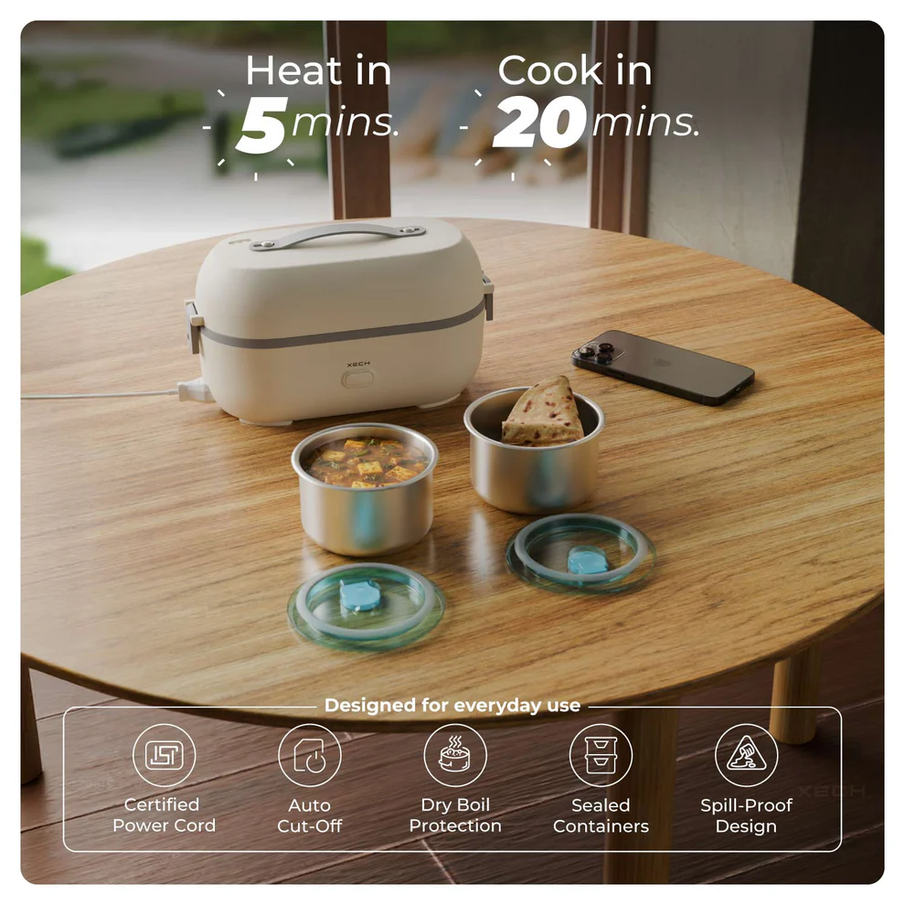 Tired of cold lunches or waiting 30 minutes just to warm up your food? Meet the ultimate electric lunch box built for India’s fast-paced lifestyle. With SafeSteam™ Technology, it uses 360° steam circulation — a cleaner, safer, and healthier alternative to microwave radiation — to heat your meal evenly in just 2 minutes.