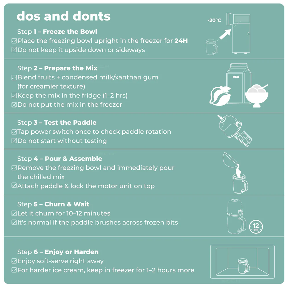 Make everything from sugar-free ice cream, protein-packed treats, and fruity sorbets to classic chocolate ice cream, all without stepping out. Just mix your ingredients, pop the bowl in the freezer, and enjoy fresh, homemade fun with every scoop.